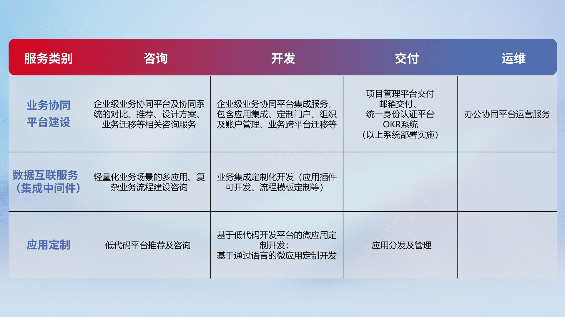 针对钉钉、、、企微、、IDaas等平台级产品提供产品的规划、、、方案、、交付、、、定制化开发等服务,,实现如统一协同办公、、、智能客户服务、、、混合会议管理、、、、智能数据查询、、等业务场景,,,实现数字化转型。。。。