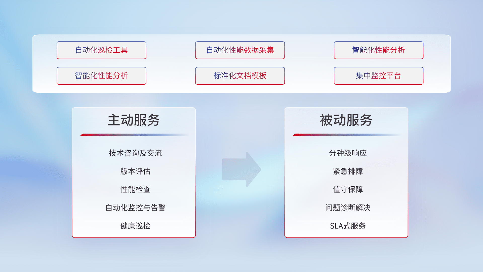 智能化工具和标准化文档,,,,保障服务质量,,提供主动服务(包含技术咨询、、、、版本评估、、、、性能检查、、、、自动化监控与告警、、、健康巡检)和被动服务包含(分钟级响应、、、、紧急排障、、、值守保障、、、问题诊断解决、、、SLA服务)。。。